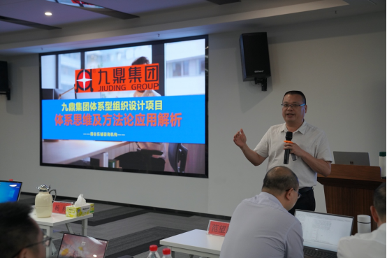 會議開始,楊董首先對體系建設理論進行了宣貫,從戰略的角度,對九鼎的過去、現在以及未來進行了深入剖析,提出了體系建設的重要性,并對體系建設的含義、好處以及作業模式等基礎理論進行了一一闡述,為九鼎未來的發展指明了方向。