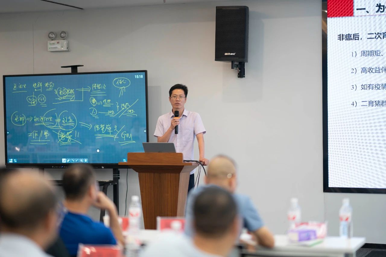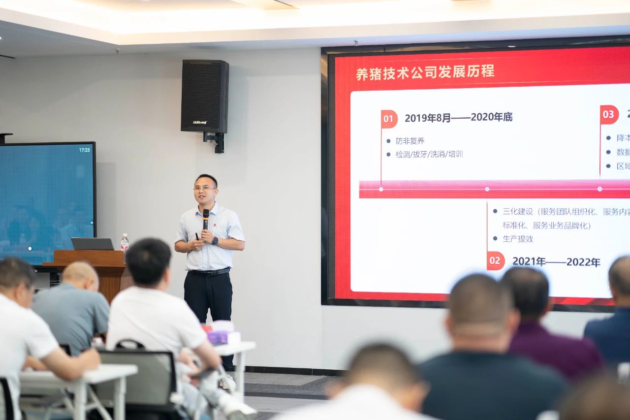 ▲集團研發中心總經理江書忠介紹了《家庭農場養豬E平臺》和《通過體況管理提升母豬生產成績》